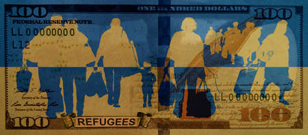 Silhouette of refugees from Ukraine on the texture of a hundred-dollar bill.