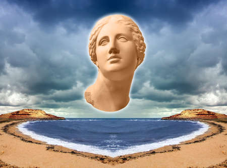Surreal modern conceptual art poster with ancient statue face and sky. Collage of contemporary art.