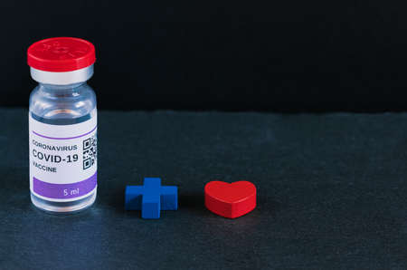 Vaccine, plus symbol and heart on a black background. Coronavirus vaccine for the treatment and prevention of Covid-19. A mass vaccination means quality of life, a better future for all mankind.