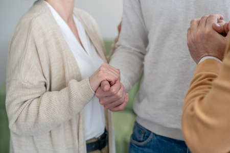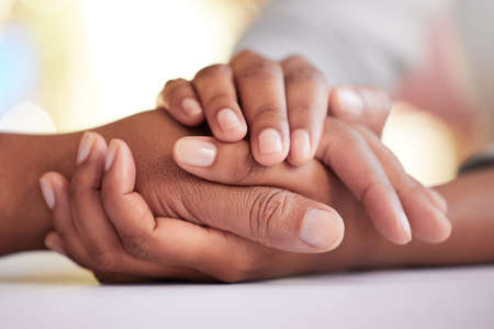 Hands of young supportive female counsellor holding those of mature woman