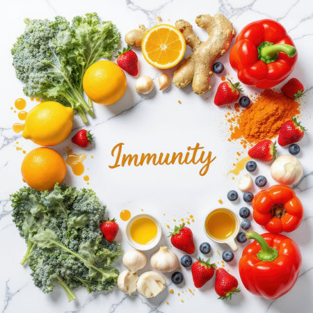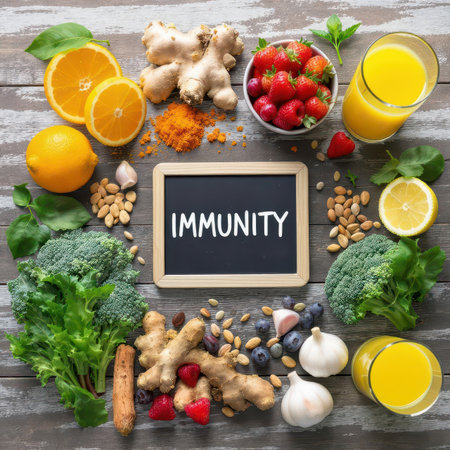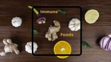 Assortment of fresh fruits, vegetables, and spices known for boosting the immune system, including oranges, ginger, broccoli, and turmeric, arranged on a rustic wooden surface with an immunity sign.