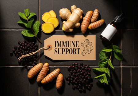 A flat lay composition showcasing natural ingredients like ginger, turmeric, elderberries, and mint, along with a dropper bottle, all arranged for immune system support and wellness.