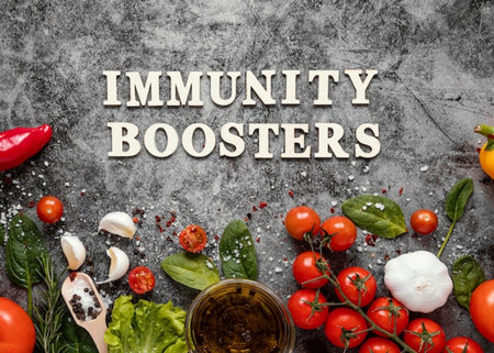 The word IMMUNITY BOORSES and fresh vegetables on stone background