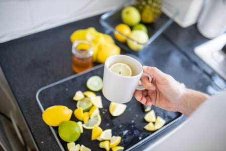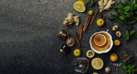Tea with lemon and honey, Immunity boosting and cold remedies, top view.
