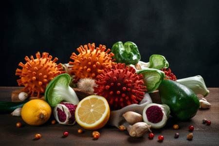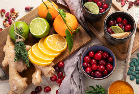Ingredients for making immunity boosting, health food selection for cold remedy, foods rich in antioxidants, minerals, vitamins, creative toned
