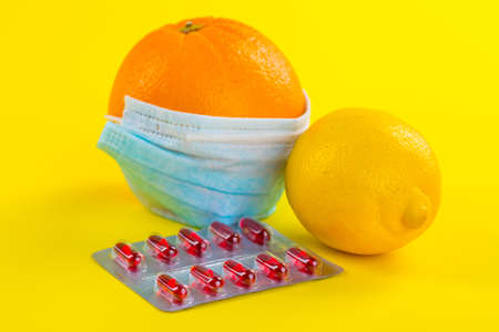 Inscription immune booster, fresh ripe fruits with vegetables and protective mask. Source natural healthy vitamins and minerals. Beneficial eating in times of Covid-19