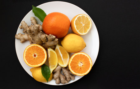 citruses on a white plate, oranges, lemons and ginger on a white plate on a black background.