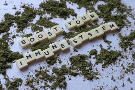 Alphabet text of Boost Your Immune System on green matcha tea powder.