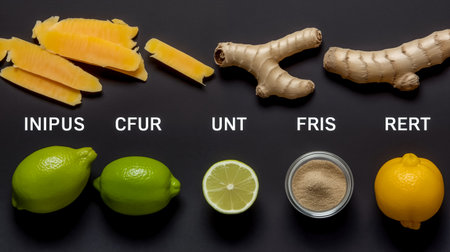 Healthy ingredients for skin care with lemon, ginger, honey, nuts and lemon.