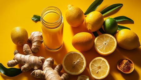 An enticing array of colorful fruits and vegetables, including oranges, ginger, berries, and greens, captures the essence of healthy living.