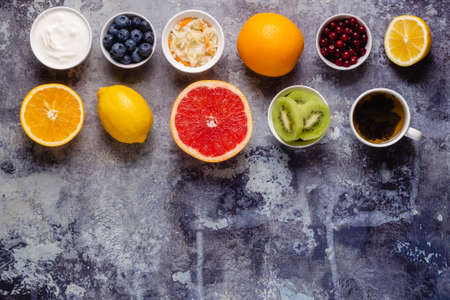Trendy Virus protection food, immunity concept. Assortment product of rich in antioxidants and vitamins sources on grey background, Healthy food nutrition dieting concept.