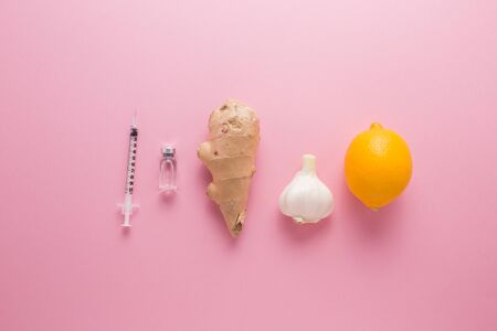 Lemon garlic ginger on a pink background. The body's natural defense against disease. The choice to take natural medicines or pharmacology.