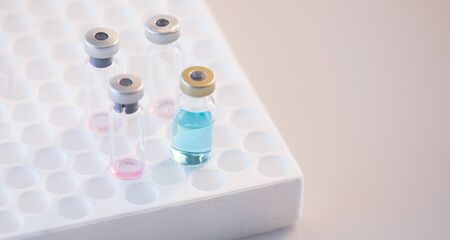 close up on vaccine bottle for medical sample set at pharmaceutical operation room or scientific laboratory for fight and protect coronavirus (MERS-n COV) concept