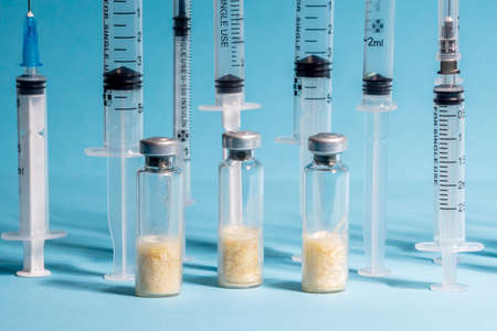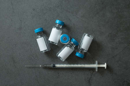 Coronavirus vaccine vials. Covid-19 vaccination with vaccine ampoules and syringes. Vaccine against the pandemic. Blue background. Stop Covid concept. Clinical trial.