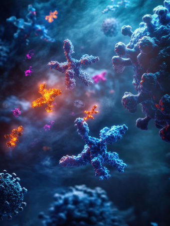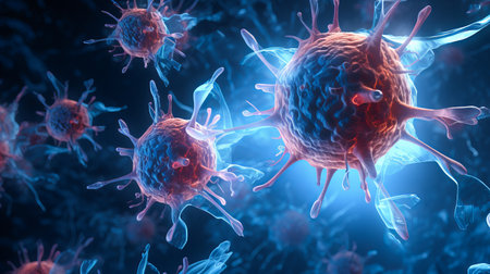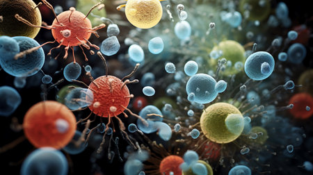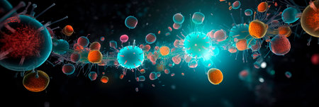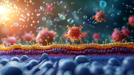 Colorful microscopic view of immune cells and pathogens engaging in a biological defense process under a bright light