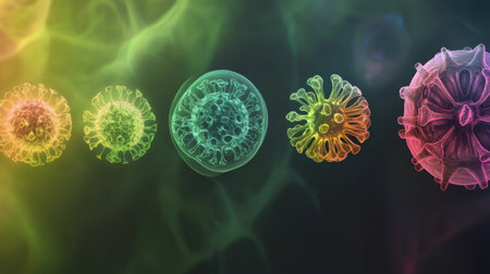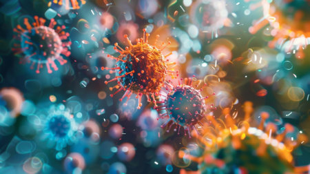 Colorful viruses engage with cells in a dynamic environment, highlighting their intricate interactions and potential impacts on health.