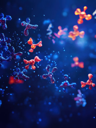 Antibodies are actively targeting glowing viruses, showcasing a vibrant visualization of immune system interaction in a dark environment.
