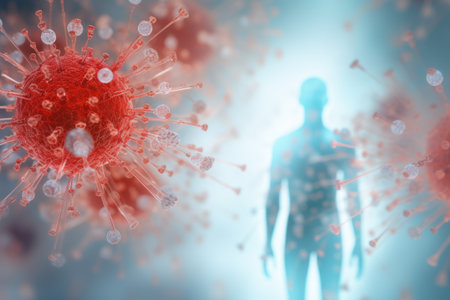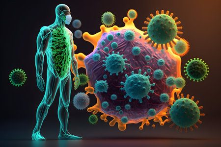 3D rendering of a human figure with virus cells in the background