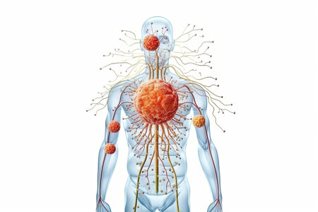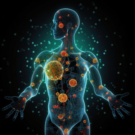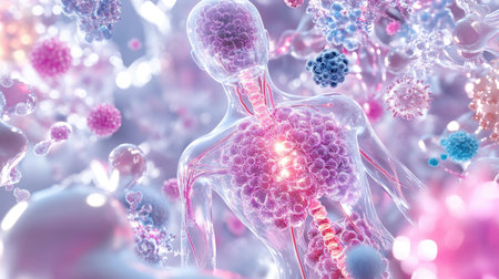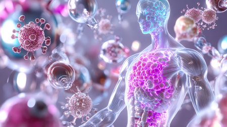 A stunning visualization of the human body highlighted with cells and microscopic organisms, showcasing the complexity and beauty of biological systems. Ideal for educational and scientific purposes.