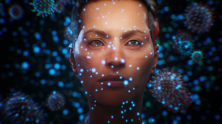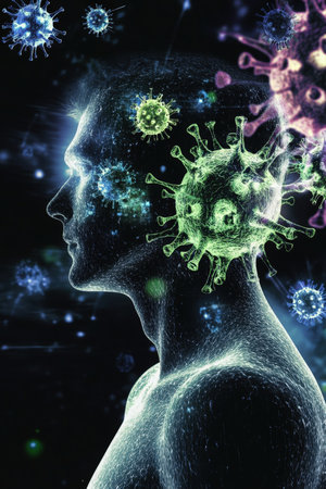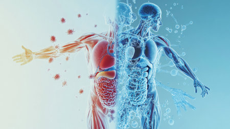 This 3D illustration portrays human anatomy interspersed with virus cells and molecular structures, reflecting the complex interactions in biological systems and health.
