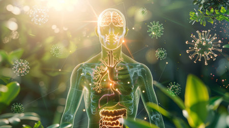 Conceptual image of human body with highlighted immune system responding to invading virus particles among green foliage.