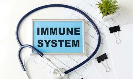 Medical concept - Stethoscope with notebook and clipboard writing Immune System