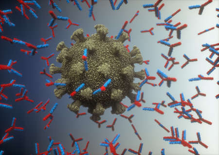 Immunological system, antibodies attacking the virus. 3D illustration, concept of the body's defense system. Y-shaped antibody attacking the virus.