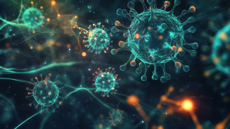 Microscopic view of viruses illustrating cellular interactions in a dark environment