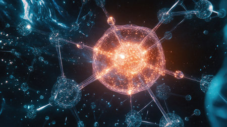 Detailed medical research concept featuring cellular structures, networks, and data visualization