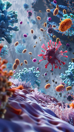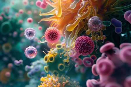 Explore a vibrant, abstract illustration showcasing microorganisms in a dynamic environment, emphasizing intricate details and a vivid color palette.