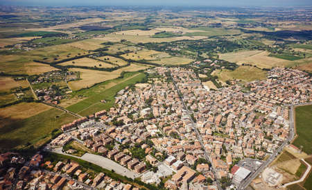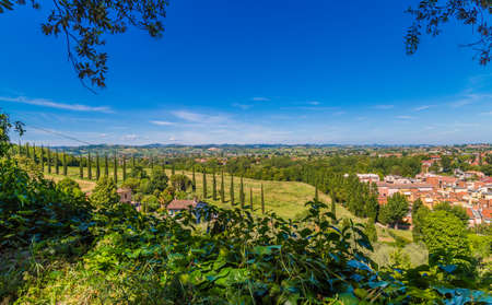 typical view of green countryside of Emilia Romagna, in Italy, with small village and cultivated fields, in summer