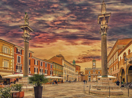 Sunset aerial panorama of Cesena in Emilia Romagna Italy near Forli and Rimini, with the medieval Malatestiana castle, Piazza del Popolo and Roman Catholic churches and cathedral on a winter afternoon