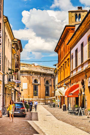 PARMA, ITALY - SEPTEMBER 10, 2014: day view of downtown main street with shops and citizens in Parma, Italy. Parma is famous for its prosciutto (ham), cheese, architecture and music