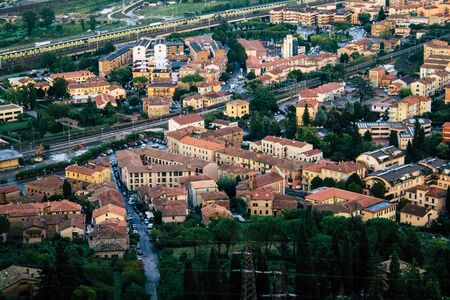 Aerial view of colorful medieval Italian houses with red roofs in Cesena, Cesena Forli provice, Emilia Romagna Italy