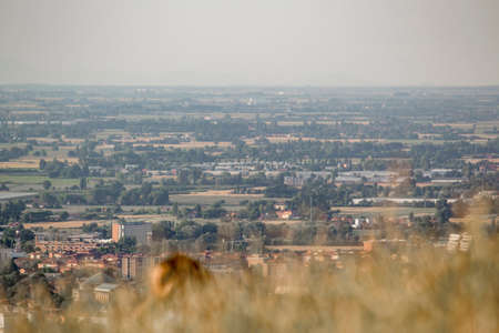 Panoramic view of Bologna from Bolognese hills. The city in background with rural fields and wheat in close up. Emilia Romagna Region, Italy