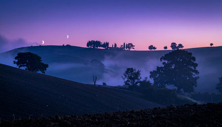 Early morning in Tuscany, Italy. Silhouettes of trees and mountains