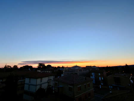 Scenic landscape of sunrise on Modena plain in Emilia Romagna region, Italy, with spectaculer colors, colorful orange and blue sky and clouds
