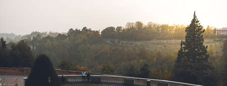hazy autumn scene of countryside, peaceful outskirts of parma with rolling hills and distant buildings