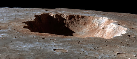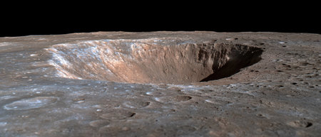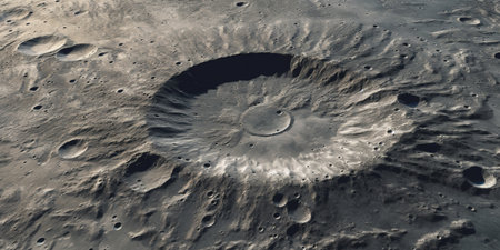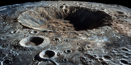 Rugged lunar landscape with deep crater