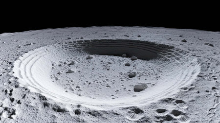 The surface of the moon is covered in dust and rocks, with a large crater showing distinct concentric layers on its inner rim