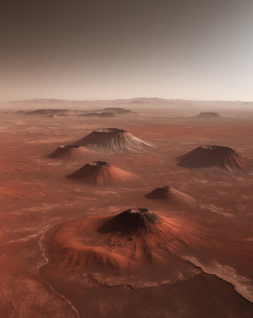AI Generated. Aerial view of Mars weathered and dusty surface shows evidence of volcanism in its geological past
