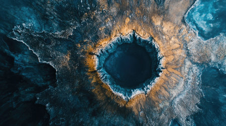 A stunning and detailed view of an impact crater on Earth’s surface, created by a large meteor, showcasing intricate patterns and geological features.