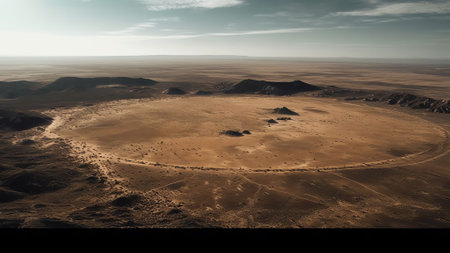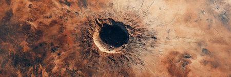 Satellite capturing a massive meteorite crater impacting a vast, desolate desert surface, showcasing the raw power of cosmic events and the dramatic transformation of the landscape