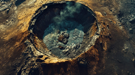 A massive crater on a barren landscape with steam rising from its depths.