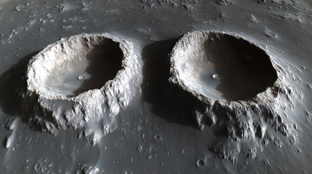Two distinct craters on the Moon's surface showcase their unique, circular formations.