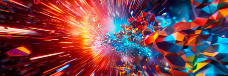 Dynamic abstract illustration featuring fractured geometric shapes exploding from a central point of radiant light. The composition conveys a sense of energy, motion, and modern technological advancement.