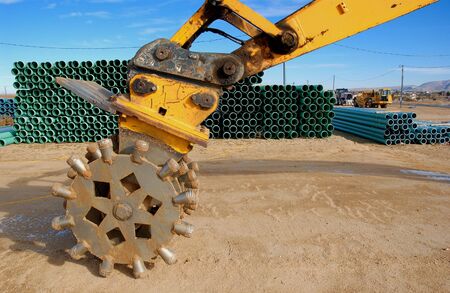 Close up view of a heavy-duty jackhammer breaking concrete at a construction site. Dust fills the air as the equipment presses down into the surface. The activity shows an ongoing building project.
