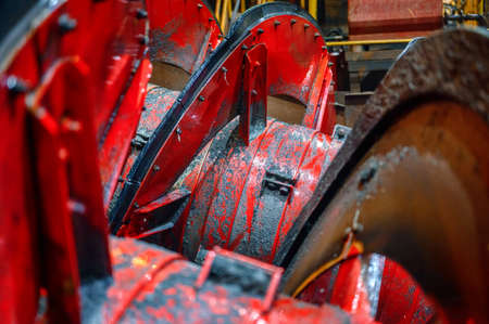 Part of lathe in workshop is close-up. Old lathe for metal processing stands in factory premises. Industrial background.