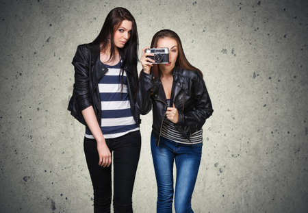 Young woman is taking a photo of her friends on digital camera at autumn forest.
