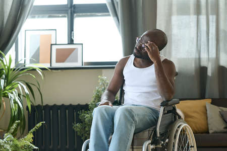 African American man sitting in wheelchair alone in the room and thinking about something